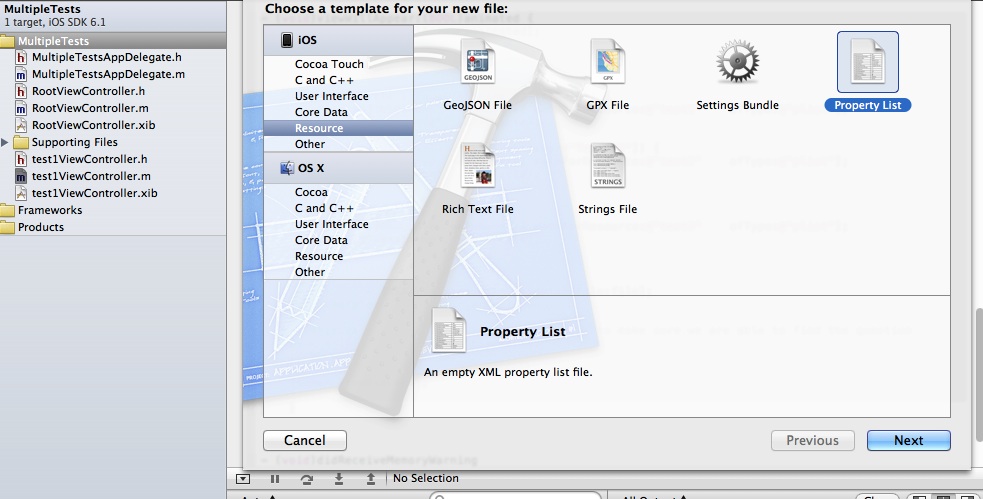 - Create each plist file by selecting the MultipleTests folder, right clicking, selecting New File, selecting iOS resource and selecting