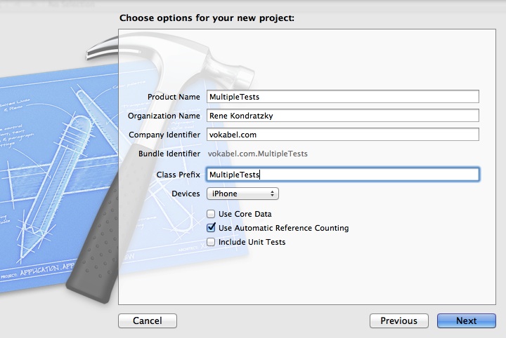 - Specify the product name as MultipleTests and the class prefix as MultipleTests
