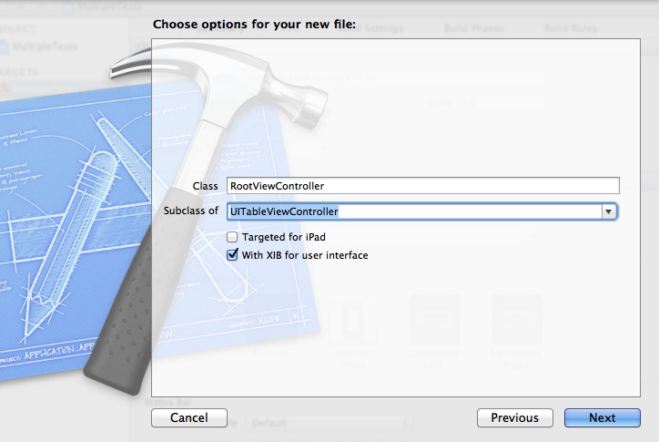 that "with XIB for user interface" is checked, and name the class RootViewController