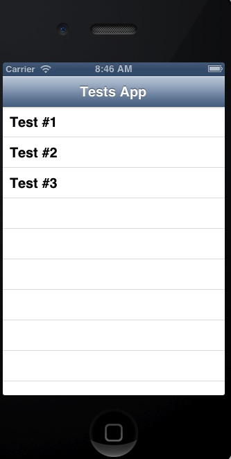 - Now we can code the navigation logic to display the appropriate test when the user clicks on Test #1, Test #2, and Test #3. Open RootViewController.m and