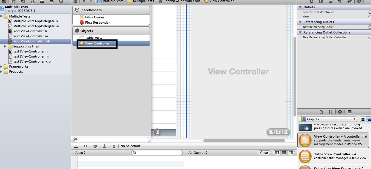 - Select the RootViewController.xib file and drag a ViewController object to the *Objects* panel