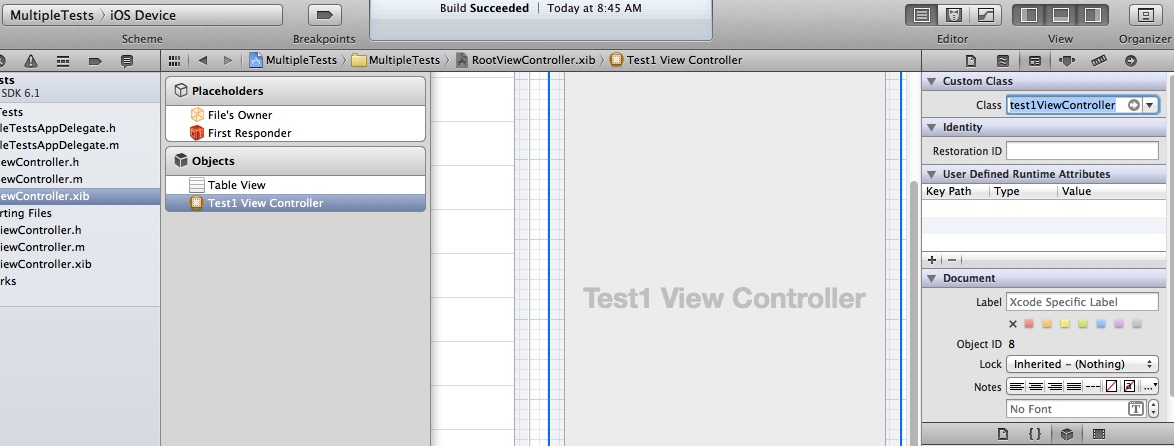 - Click on the test1ViewController.xib file that you just replaced and you should see the familiar screen that you created in part 1