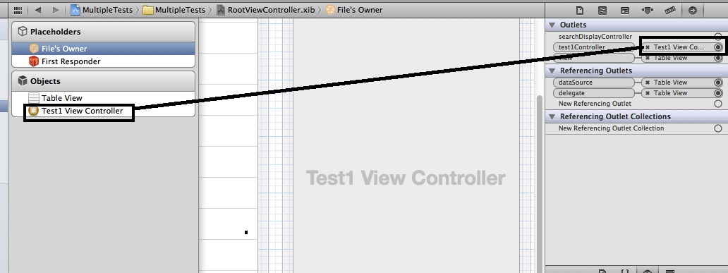 - Select the Files Owner entry under Placeholders. Open the Connections Inspector. Click in the circle located to the right of the test1Controller outlet and drag the mouse to the test1 View Controller in the Objects panel