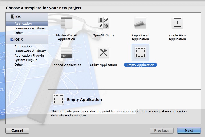 - Bring up xcode and select File->New->Project. Select an iOS application