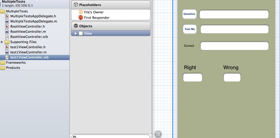 - Click on the test1ViewController.xib file that you just replaced and you should see the familiar screen that you created in part 1